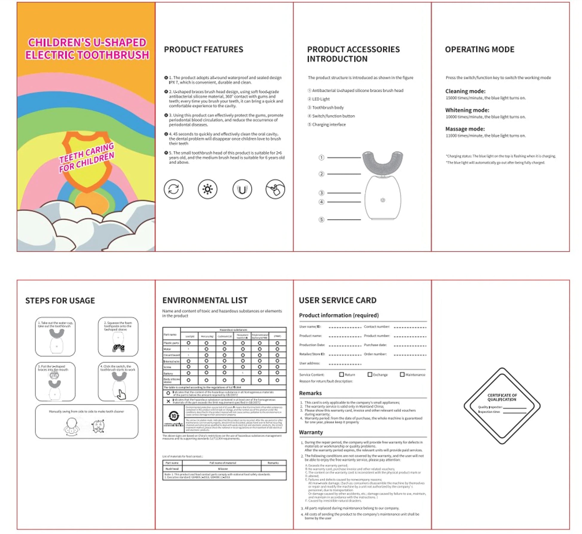 Introducing the Kids Electric Toothbrush, the perfect toothbrush for your little ones! This toothbrush features food-grade silicone that is soft and gentle on gums, as well as two types of brush heads to fit different aged children. The cleaning modes are designed to meet the needs of different periods, with options for a massage mode, gentle mode, cleaning mode, gum protection mode, and deep cleaning. In addition, this toothbrush features magnetic levitation sonic cleaning and a short axis magnetic suspension motor for a light weight and short wheelbase that is perfect for children. It also has a USB fast charging feature so you can charge it in just 2 hours, and it is also waterproof with an IPX7 rating.